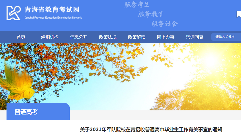 【导语】©无忧考网从青海省教育考试网了解到,2021年军队院校在青招收普通高中毕业生工作有关事宜的通知已经发布,为发布考生了解情况,现将有关事宜通知如下: