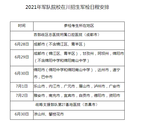 6月27日,四川省教育考试院在门户网站公布军检分数线和上线考生名单,除凉山州、攀枝花市上线考生,省内其余市(州)上线考生均在成都片区参加军检。考生本人应及时自行查询是否进入军检名单,也可向当地军分区(警备区)、县级人民武装部问询。