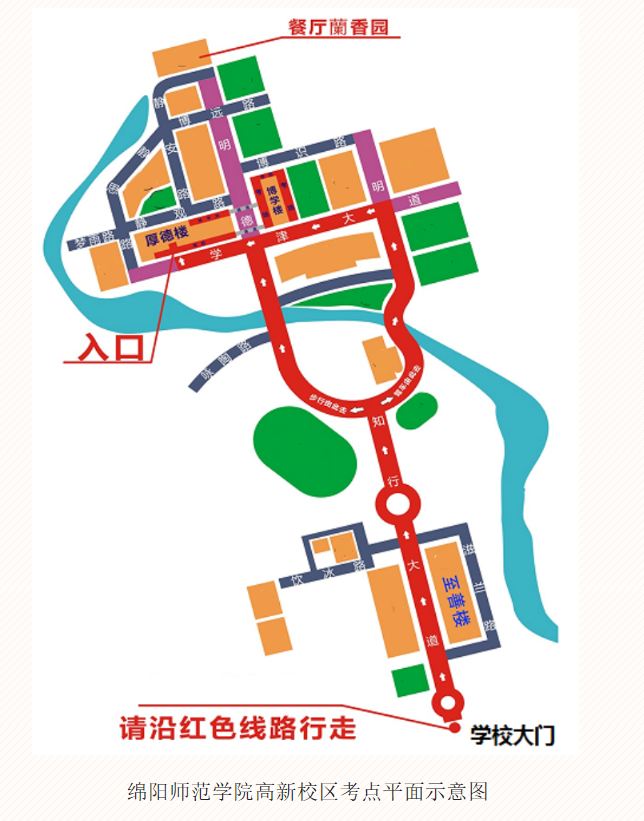 绵阳师范学院高新校区(绵阳市高新区绵兴西路166号)厚德楼E入口排队,考场设在厚德楼和博学楼,请根据考场引导标识单循环通行。