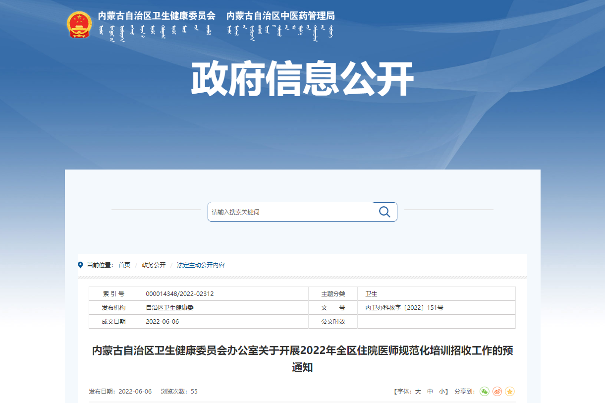 根据国家卫生健康委《住院医师规范化培训招收实施办法(试行)》(国卫办科教发〔2015〕49号)和自治区卫生健康委《自治区住院医师规范化培训招收实施办法(试行)》(内卫计办科教发〔2016〕33号)要求,自治区卫生健康委拟于7月上旬开展2022年全区住院医师规范化培训招收工作。现将招收工作预通知如下: