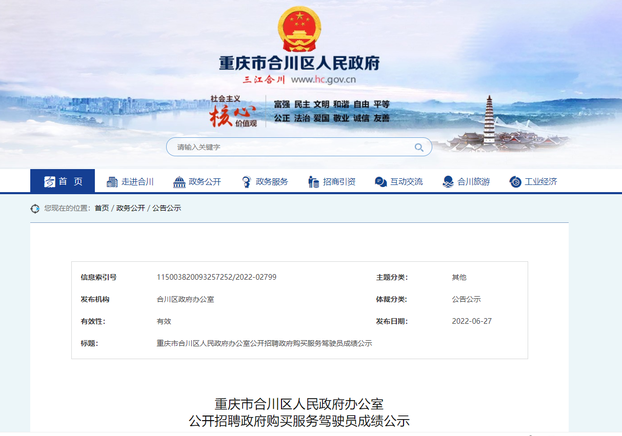 根据《重庆市合川区人民政府办公室公开招聘政府购买服务工作人员简章》规定,我单位组织开展了报名、资格审查、专业技能测试、面试等工作,现按照有关规定,对考生成绩予以公示。