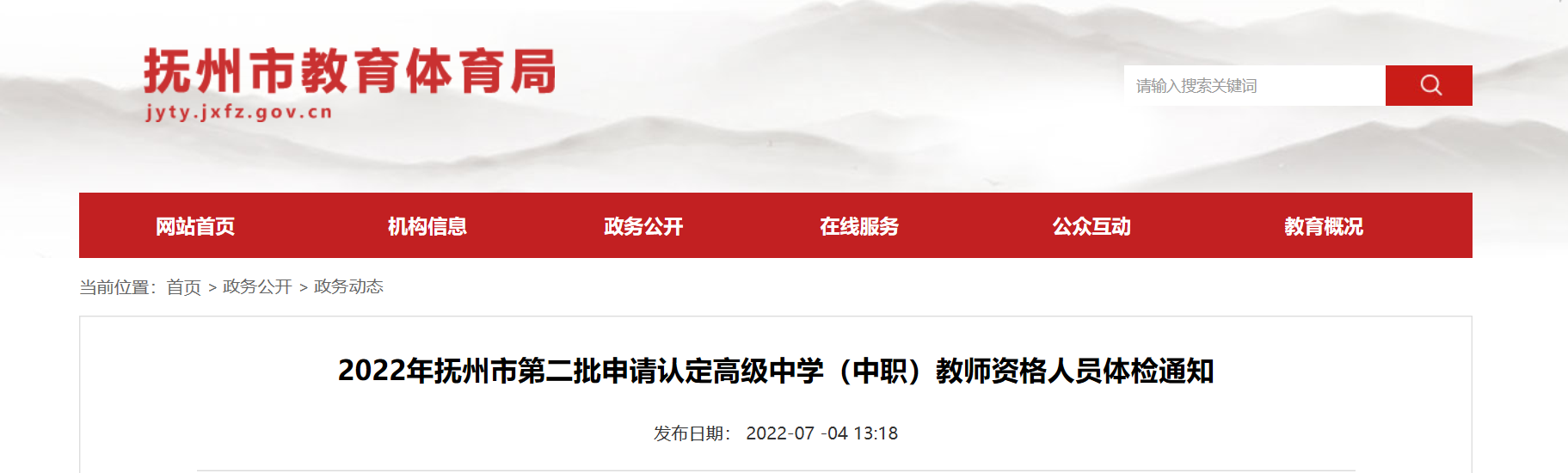 根据《关于做好2022年江西省中小学教师资格认定工作的通知》精神和我市2022年开展认定教师资格工作日程安排,兹定于2022年7月10日对已经进行了第二阶段现场确认的人员进行集中体检。为确保体检工作有序进行,现将2022年申请教师资格人员体检有关工作通知如下: