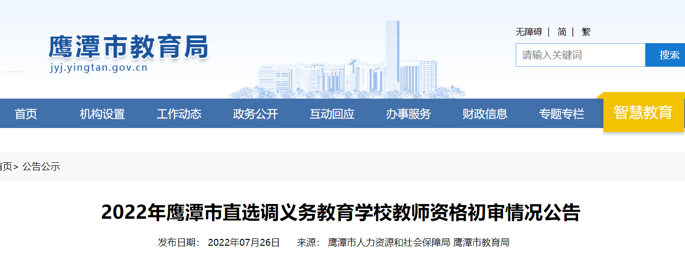 根据《2022年鹰潭市直选调义务教育学校教师公告》,7月18日至7月20日报名,经鹰潭市选调中小学教师工作领导小组同步资格初审,现将资格初审情况予以公告:一、直接进入面试人员名单(详见附件1)