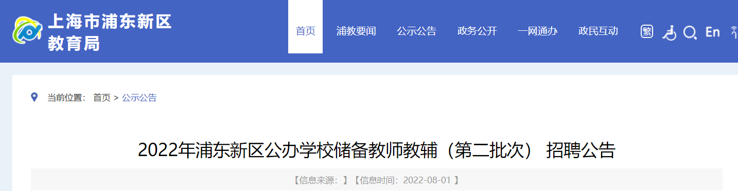 浦东新区部分公办学校面向应届毕业生和社会人员公开招录一批储备教师教辅,通过浦东新区公共人力资源公开招聘平台实施,录用后由浦东新区人才市场统一劳务派遣,计划于2022年9月上岗。本次计划招聘储备教师教辅共874名,含储备教师672名,卫生保健153名,财务会计49名。现将有关事项公告如下:一、招聘对象和条件