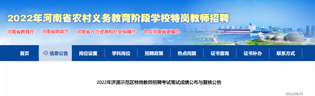 2022年河南省农村义务教育阶段学校特岗教师招聘考试统一笔试考试的考生,8月23日9:00可登陆2022年河南省农村义务教育阶段学校特岗教师招聘网站进行成绩查询。根据济源示范区疫情防控要求,此次成绩复查采取电子邮件的方式进行,不接受现场申请和电话查询。考生若对成绩有异议,需提交手写申请照片、身份证照片及手持身份证的露脸照、准考证照片,于8月24日12:00前发送到463036221@qq.com邮箱,过时不再受理复核事宜。
