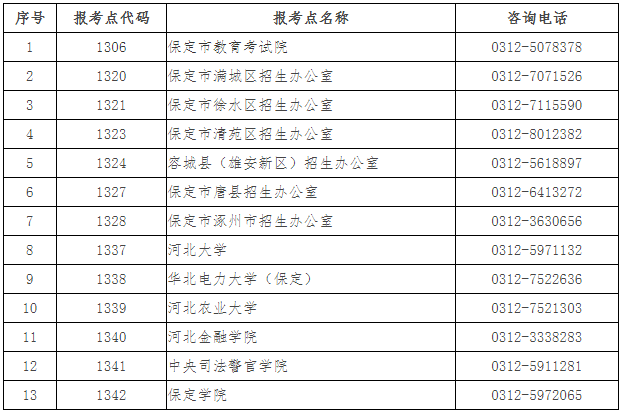 1.高校报考点:我市6个高校报考点,只接收本校应届本科毕业生考生报考。报考点代码及名称为:1337河北大学(含河北大学工商学院)、1338华北电力大学(保定)(含华北电力大学科技学院)、1339河北农业大学(含河北农业大学现代科技学院)、1340河北金融学院、1341中央司法警官学院、1342保定学院。
