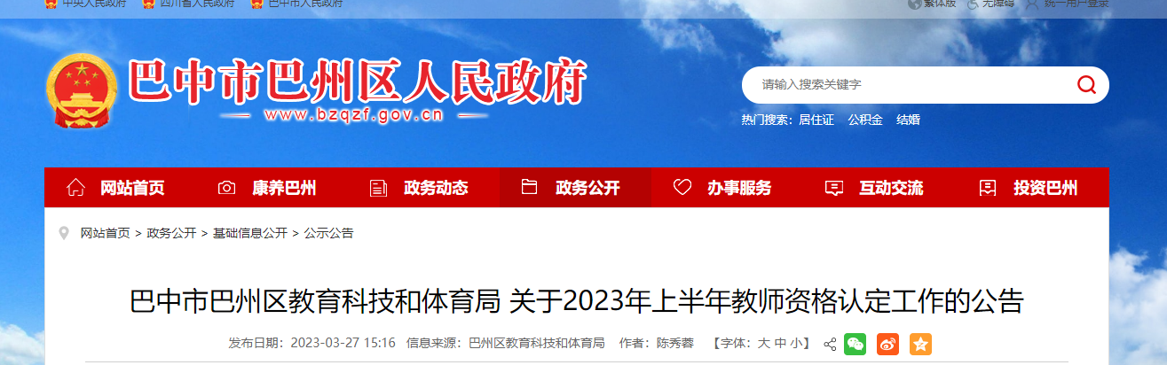 原文标题:巴中市巴州区教育科技和体育局 关于2023年上半年教师资格认定工作的公告