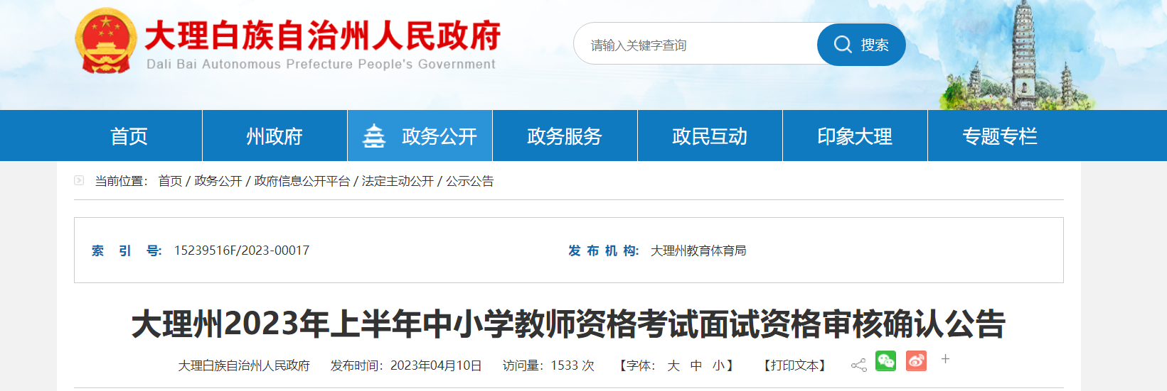 原文标题:大理州2023年上半年中小学教师资格考试面试资格审核确认公告