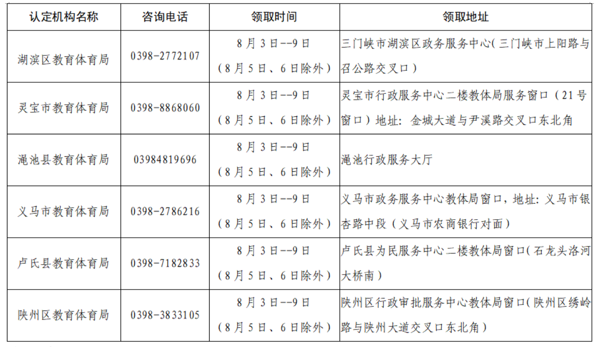 8月3日--9日(8月5日、6日除外)到三门峡市政务服务中心7楼706教育局窗口(三门峡市崤山路与宋会路交叉口银山大厦)领取。