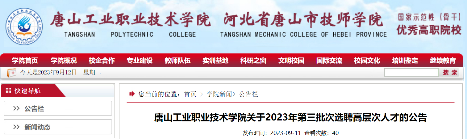 9月1日在唐山人力资源和社会保障局事业单位人事管理栏目(https://rsj.tangshan.gov.cn/ecdomain/framework/tsrsw/loilinendfaebbolkgphjjlbamloaief.jsp)、唐山工业职业技术学院(www.tsgzy.edu.cn)等网站发布选聘信息。与此次招聘相关信息发布请应聘人员关注唐山工业职业技术学院。