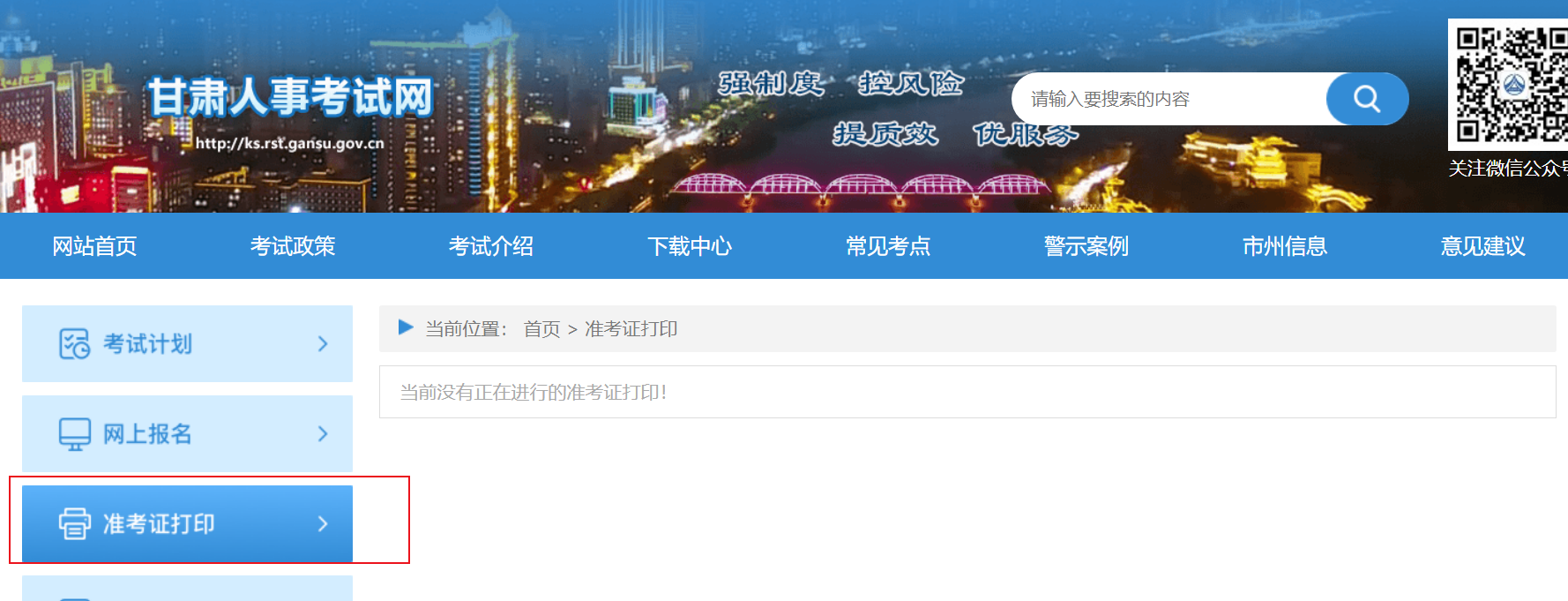 报考人员需登录“甘肃人事考试网”(http://ks.rst.gansu.gov.cn),进入“准考证打印”栏目,按照提示打印本人准考证并妥善保管,以备考试、资格审核等环节使用,无本人《准考证》的,视为自动放弃。报考人员打印准考证后,应认真阅读《准考证》考生须知,并提前熟悉考点。