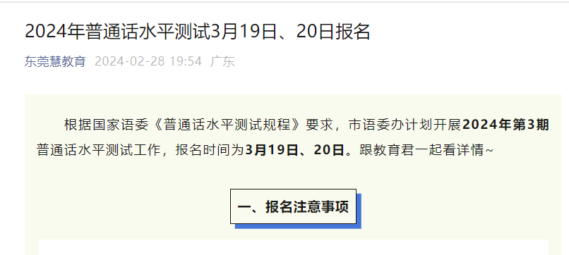 根据国家语委《普通话水平测试规程》要求,市语委办计划开展2024年第3期普通话水平测试工作,报名时间为3月19日、20日。跟教育君一起看详情~
