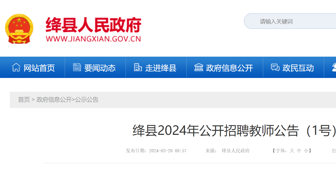 2024年3月20日至2024年3月26日,通过绛县人民政府门户网站(网址:http://www.jiangxian.gov.cn)、山西省人力资源和社会保障厅公开招聘专栏发布招聘公告。公告内容包括:招聘单位名称,招聘岗位和人数,招聘岗位所需资格条件,报名时间以及其它需要说明的事项,公告期为7天。