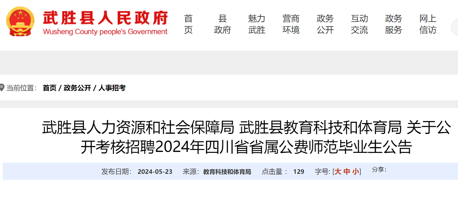 (一)武胜县人民政府网(http://www.wusheng.gov.cn/)为本次我县公开考核招聘2024年四川省省属公费师范毕业生后续信息的官方发布渠道,请各位考生随时关注本网站发布的相关信息。因考生本人未及时在武胜县人民政府网查阅相关信息,导致本人未能按时参加资格审查、面试、选岗、签约、体检、考核等环节的,责任概由考生本人自行承担。