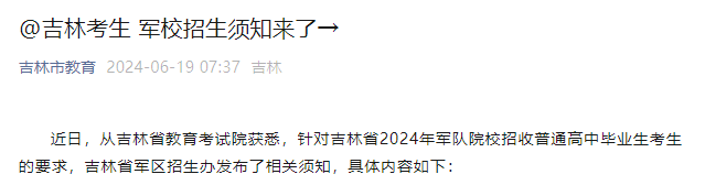 【导语】©无忧考网从吉林市教育了解到,2024年吉林省军队院校招收普通高中毕业生考生须知公布,相关事宜详情如下: