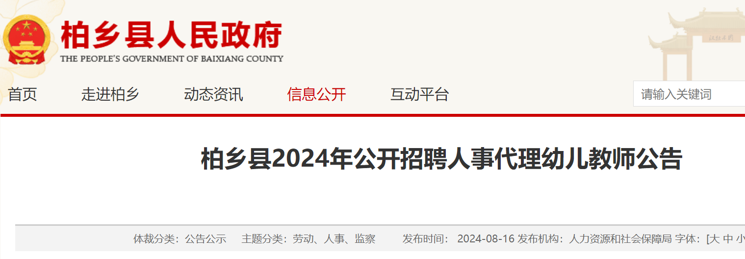 2024年8月16日通过柏乡县人民政府网(http://www.baixiangxian.gov.cn)、报名网站(www.xtrsksw.com)向社会公开发布招聘公告。