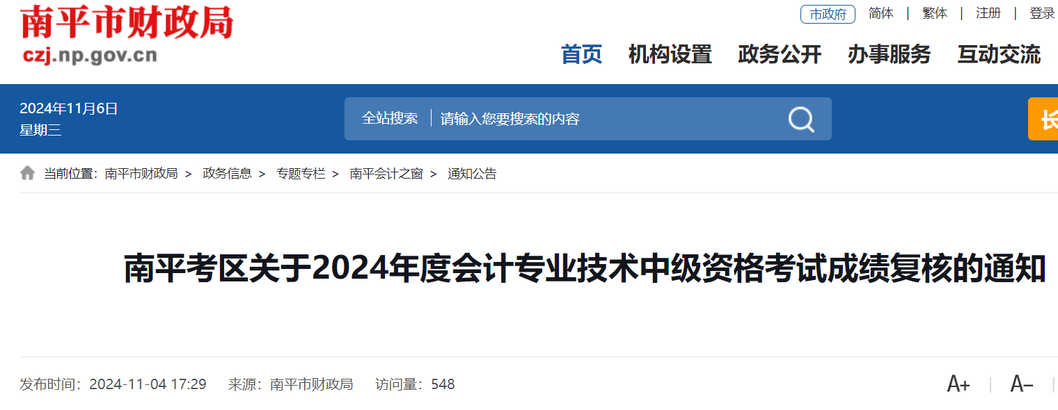 2024年度会计专业技术中级资格考试成绩已在财政部会计资格评价中心网(http://kzp.mof.gov.cn/)公布,需要复查成绩的考生,请于2024年11月10日(工作日)前到报名所在地的财政局提交书面成绩复核申请材料。各县(市、区)财政局将考生申请材料及时汇总上报到南平市会计考试管理中心,统一复核成绩。
