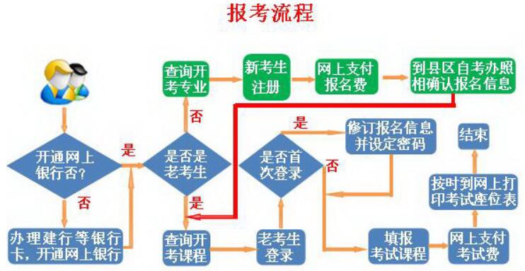 1.新生首次报考,须使用身份证号登陆网站报名(密码为身份证号),填写本人自然信息和手机号、确认照相地点和考试地点、支付电子注册费后,到当地自考办确定的报名点进行现场照相,然后填报课程,在线支付报考费用,完成报名过程。