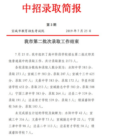 【导语】©无忧考网中考频道从宣城市教育招生考试院了解到,2019年安徽宣城第二批中考录取分数线已公布,具体安徽宣城第二批中考分数线如下: