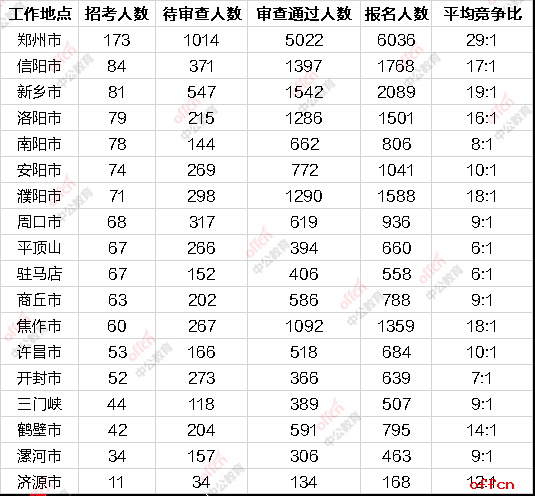 从河南省各个地市报名情况来看,截止到10月21日9时,报名人数最多、审查通过人数最多以及待审查人数最多的都是郑州的职位,这也跟郑州的职位数和招考人数最多有关。具体见下表: