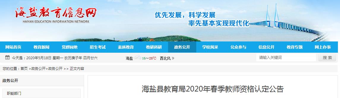 根据《中华人民共和国教师法》、国务院《教师资格条例》、教育部《〈教师资格条例〉实施办法》、《浙江省实施〈教师资格条例〉细则》、《浙江省中小学和幼儿园教师资格考试改革试点工作实施方案》、《教育部教师资格认定指导中心关于做好2020年教师资格制度实施工作的通知》(教资字〔2020〕1号)、《浙江省教育厅教师资格认定指导中心关于做好2020年上半年中小学教师资格认定工作的通知》(浙教资〔2020〕1号)、《浙江省教育厅教师资格认定指导中心关于2020年上半年中小学教师资格认定工作的公告》和《嘉兴市教育局2020年上半年教师资格认定公告》等法律、法规及有关规定、通知精神,结合我县教师资格认定工作实际,现就2020年海盐县春季教师资格认定工作的有关事项公告如下: