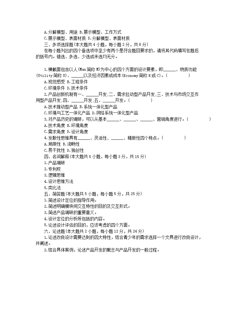 【文档名称】2012年7月浙江省高等教育自学考试产品设计程序与方法试题(Word版)